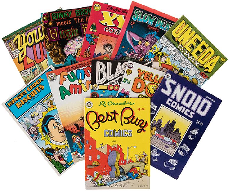 Crumb, Robert. Group of a Dozen Comic Books. Including Yellow Dog Comics Vol. 2 No. 13 (Print Mint, 1969; two copies); Funny Animals No. 1 (Apex, 1972); Black and White Comics No. 1 (Apex, 1973); Snoid Comics No. 1 (Kitchen Sink, 1979); Best Buy Comics No. 1 (Apex, 1979); Uneeda Comix No. 1 (Print Mint, 1971); Hungry Chuck Biscuits No. 1 (Krupp, 1971); XYZ Comics N# (Kitchen Sink, 1972); Slow Death Funnies (Last Gasp, 1970); Binky Brown Meets the Holy Virgin Mary (Last Gasp, 1972); and Young Lust No. 3 (Last Gasp, 1972). A group with outstanding eye appeal, covers generally bright and crisp with square bindings, with some light scuffing and creasing to a few issues.