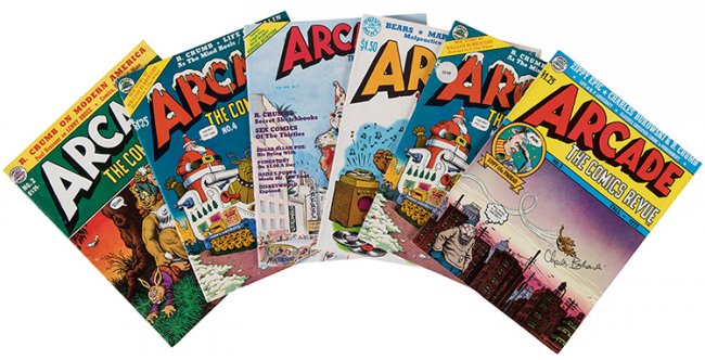 Crumb, Robert. Arcade: The Comics Revue. Group of Six Comic Books. Print Mint, 1970s. Including No. 2 (1975); No. 3 (1975); No. 4 (1975; two copies, one marked $1.25, the other with $2.50 over-sticker); No. 6 (1976); and No. 7 (1976). Clean copies with bright covers, scattered light wear to edges and spines.