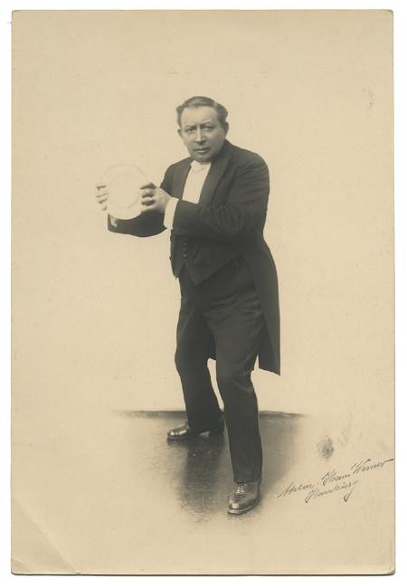 Goldin, Horace. Full-Length Portrait. Hamburg, ca. 1920s. Double-weight sepia matte print, depicting the conjurer with a plate held between his hands. 7 x 5”.