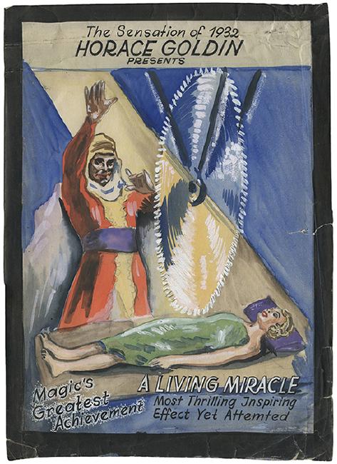 Goldin, Horace (Hyman Elias Goldstein). Original Watercolor Artwork for Goldin’s “Living Miracle” Illusion (Sawing in Half). Circa 1932. Handsome and vibrant original artwork depicting a whirling buzz saw blade descending toward a comely lady on a table, while a Bedouin-like character stands over her, one hand extended overhead. Unsigned. 12 x 8 ¾”. Edge chips, closed tears, old folds. Goldin played an important role in the development of the famous Sawing illusion, and eventually developed his Living Miracle, now commonly known as the Buzz Saw illusion. Eschewing the bulky boxes favored by Thurston and Dante, Goldin cut to the chase – literally – by laying his assistant on a table and sawing directly through her with a giant whirling blade using no covering at all. Somehow, she survived the ordeal unharmed, night after night.