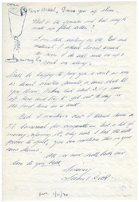 Cardini (Richard Valentine Pitchford). Three ALSs from Cardini to John Henry Grossman. Gardiner, N.Y., 1967/69/70. Three autograph letters signed “Dick” or “Swan & Dick” to Grossman, each accompanied by the original mailing envelopes addressed in Cardini’s hand. Cardini discusses in detail the construction or repair of magic apparatus including watch reels and an innovative idea for the use of flash cotton, reflections on an early unsuccessful performance in London (“I never did that routine for small children again”), business and performances, and personal matters and greetings.
