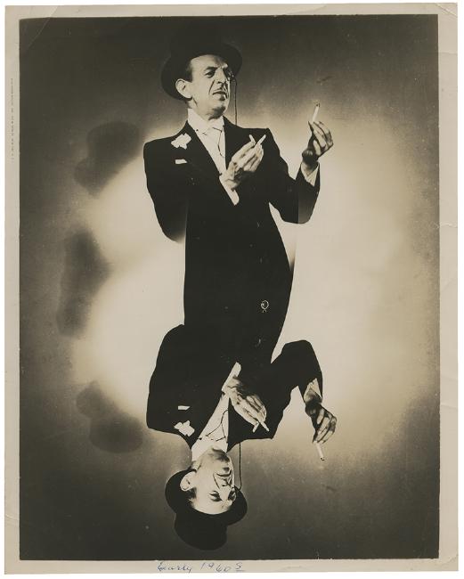 Cardini (Richard Valentine Pitchford). Cigarette Manipulation Photograph. New York: Moss Photo, ca. 1960s. Glossy sepia print, a half-length portrait using double-exposure to create a mirror reflection. 10 x 8”. Light creases, date annotation in margin.