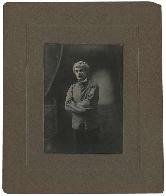 [Escapology] Portrait Photograph. N.p., ca. 1900s. Silver print three-quarter length image of the performer in straitjacket, on oversize cabinet-style mount. Image area 6 7/8 x 5”.