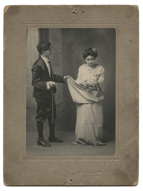 [Escapology] Child Escape Artist Portrait. Baltimore, ca. 1900. Depicting a young girl in handcuffs standing partway in a sack. The boy at her side holds the top half of the sack and a length of rope. Standard cabinet format mount. 8 x 6” overall. Tack-holes in margins; mount worn but printed image very good. Old identification annotation on verso, apparently reading: “Johnny Connor and Fasma.”