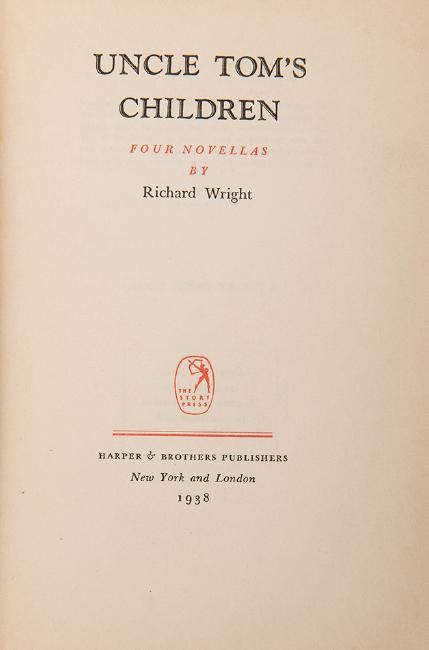 Wright, Richard. Uncle Tom’s Children. Four Novellas. New York and London: Harper & Brothers, 1938. First Edition of the author’s first book. 8vo. Spine ends and corners bumped. Hinges tender. Stamped ex-libris to f.f.e.p. and copyright page. Otherwise very good.