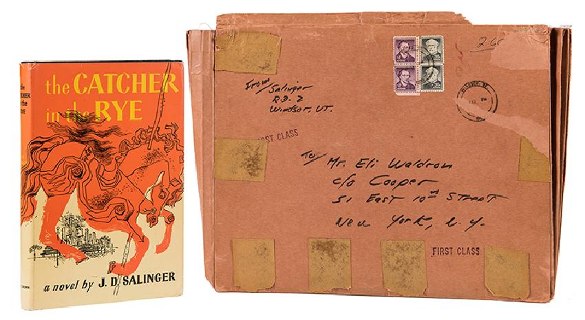 Salinger, J. D. File Folder Envelope Hand-written and Addressed by Salinger to Eli Waldron. Expandable file folder used as an envelope. Shipping and return address entirely in Salinger’s hand. Return address "Salinger/R.t. 2/ Windsor, VT" and addressed to "Mr. Eli Waldron." Postmarked 1965. 12 x 9 1/2". With a book club edition of Catcher in the Rye
