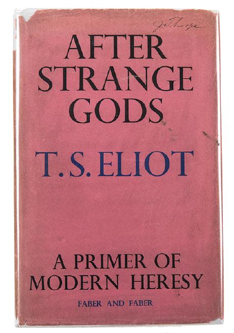 Eliot, T. S. After Strange Gods. A Primer of Modern History. London, 1934. First edition, First printing. Publisher’s black cloth. Dust jacket. Thin 8vo. Chipping to jacket. Mss. ex-libris to jacket and f.f.e.p.