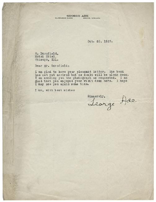 Ade, George. Typed Letter Signed, "George Ade". One page. On personal letterhead. Hazelden Farm. Brook, IN. October 25, 1927. To W. Dornfield. Left edge stained; crease to the center.
