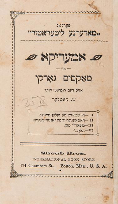 Gorky, Maxim. Yiddish Translation of America. Boston: Shoub Bros., n.d. Signed M. Gorky in Russian. Translated from Russian by S. Cutler. Recounts Gorky’s impressions of America after his visit there in 1906. 74pp. Cloth-backed marbled boards. 12mo. Edgewear to boards, verso of title page with Tel-Aviv stamping, paper missing at top right of title page taped to binding at right. Otherwise internally very good.