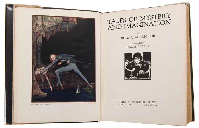 Poe, Edgar Allan (Harry Clarke, illustrator). Tales of Mystery and Imagination. New York: Tudor, 1936. Original cloth with pictorial paper cover label, pictorial dust-wrapper (several chips and tears at corners and down spine). With 8 tipped-in color plates including frontis., and 24 black-and-white plates, plus other illustrations. Black top edge. 4to. Very good.