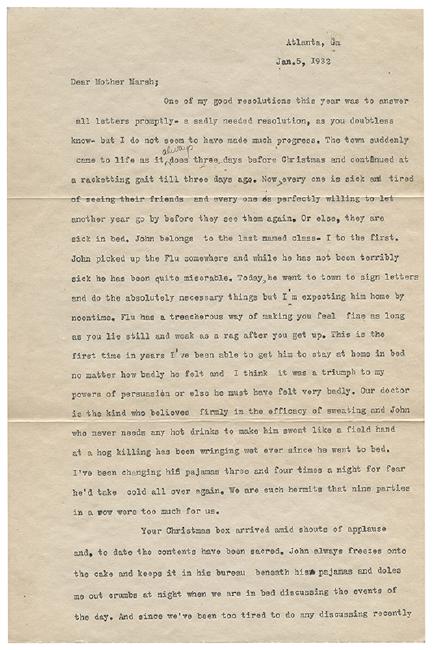 Mitchell, Margaret. Typed Letter Signed. January 5, 1932. Five pages, with corrections made in pencil. Last page includes a penciled handwritten paragraph and signed as "Peggy." To her mother-in-law, "Mother Marsh," typed four years before the success of her first novel, Gone With the Wind. In the midst of the Great Depression, Mitchell discusses it effects on her family and local community: "…Heaven alone knows when we’ll do more travelling. John is away a lot but never out of the state. We’ll have to wait till that mythical ‘corner’ is turned and salaries rise again before we go on our travels." Her flamboyant colorful writing style is evident: "Flue has a treacherous way of making you feel fine as long as you lie still and weak as a rag after you get up…" and "Your Christmas box arrived amid shouts of applause and, to date the contents have been sacred." Slight stain to one page, otherwise fine. Pages 7 x 10 1/2".