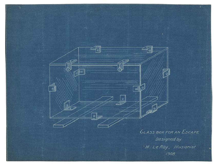 McCafferty, Leroy. Group of Illusion and Escape Blueprints, Programs, and Handbills. Connecticut, 1900s. Twenty-nine pieces, including blueprints or sketches for a Glass Box for an Escape, Card Rise, Packing Case Escape, Aga Levitation, Cremation Casket, and others untitled; and a file of programs and handbills for the magician and illusionist, two in which he is assisted by Henry Ridgely Evans.