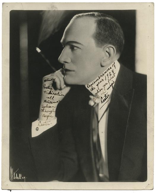 The Great Lester (Harry Lester). Inscribed and Signed Studio Portrait. Chicago, ca. 1928. Glossy silver print portrait of the famous ventriloquist in profile, holding a cigarette. Inscribed and signed twice centrally in black ink. 10 x 8”. Several creases, scuffs, pinholes.