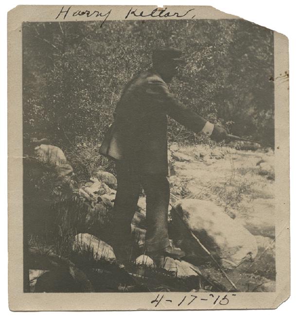Kellar, Harry (Heinrich Keller). Snapshot of Kellar Fly-Fishing. California, April, 1915. A candid snapshot of Kellar trout fishing, annotated in the margins with his name and the date. 3 ¼ x 3 ¼”. Loss in the upper right corner.