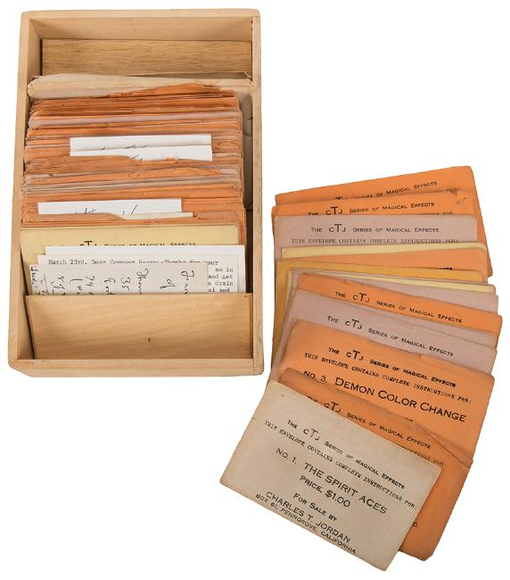 Jordan, Charles. Collection of Charles T. Jordan “CTJ Series of Magical Effects.” Issued 1919 – 1922. Seventy-seven printed instructions for various tricks devised by Jordan, each in a printed envelope bearing the trick’s name, and including effects such as The Spirit Ace, The Bewitched Umbrella, The Electrified Strippers, and many more. Includes numbers 1 – 79; lacks nos. 24, 51, and 58. Sold together with eight more Jordan secrets issued in his “special service” series, to be mailed four times per month, and the two issues of Jordan’s “Four Full Hands” series. Many with photographic illustrations accompanying the directions. Envelopes all show tears and wear, contents generally very good. The Jordan secrets are accompanied by several typed postcards, signed by Karl Fulves, who collected many of Jordan’s secrets in book form. A checklist of Jordan tricks in the hand of Dr. John Henry Grossman also accompanies the lot, along with a photograph of Jordan in his later years, and a negative of the image. A scarce assemblage of secrets rarely encountered. Jordan was a clever inventor of sleight-of-hand and other magical methods. His interest in the art was first piqued in 1908, but it was not until 1919 that he began publishing his ideas. He released a steady stream of booklets and individual effects until 1923, when his interest in conjuring waned. His effects were later published by Ted Annemann, and anthologized in book form. He made his living as a chicken farmer in Petaluma,