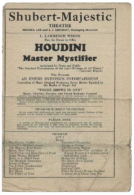 Houdini, Harry (Ehrich Weiss). Shubert-Majestic Theatre Program. Providence, R.I., ca. 1925. Four-page program fully devoted to Houdini’s act, including a full magic act, illusions and escapes, anti-spiritualistic displays, and more. Old folds.