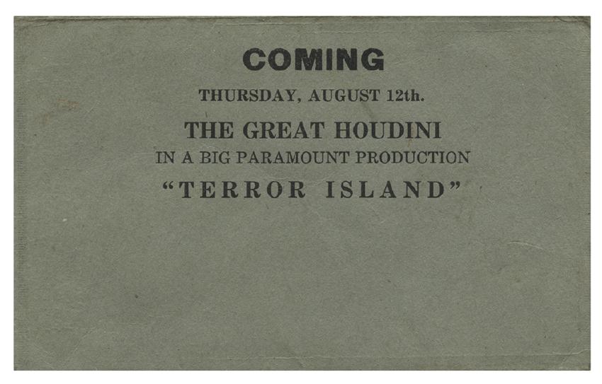 Houdini, Harry (Ehrich Weiss). Terror Island Theater Playbill. Chicago, 1920. Houdini’s feature film listed on the rear panel as a coming attraction. Other silent features round out the program; tipped-in halftone photo of Paramount starlet Marguerite Clarke. 5 x 9” unfolded.