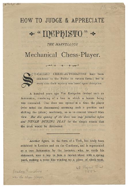 How to Judge & Appreciate “Mephisto” The Marvellous Mechanical Chess-Player. London: G.C. Heywood, (1881). Four-page pamphlet issued by the exhibitor to arouse interest in the chess-playing automaton, offering details that set it apart from the “so-called Automatons” previously seen in London, including the Turk. With a contemporary clipping regarding another automaton, “Thavma,” and a second clipping giving chess notations on one game played by “Mephisto.”