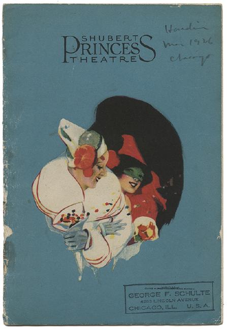 Houdini, Harry (Ehrich Weiss). Shubert Princess Theatre Program. Chicago, 1926. Original lithographic wrappers. Twelve pages. Houdini’s program enumerated across parts of four pages. Backstrip torn, but binding holding.
