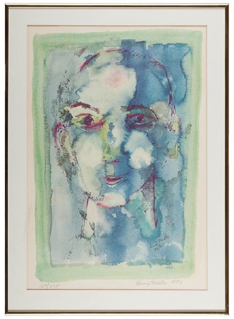 Miller, Henry. Blue Face, 1974. Color lithograph. Signed "Henry Miller" (lower right). 22 x 16". Framed.