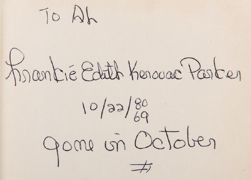 [Kerouac Parker, Frankie Edith] Kerouac, Jack. On the Road. New York: Viking Press, 1957. First Edition, Second Printing. Publisher’s black cloth lettered in white. Kerouac’s Former Wife, Edie Parker’s, Copy, Inscribed. To f.f.e.p.: "To Al / Frankie Edith Kerouac Parker / 10/22/89 69 / gone on October." 8vo. Light wear to boards. Together with two others: Kerouac & Friends: A Beat Generation Album. By Fred W. McDarrah. New York: William Morrow, (1985). Inscribed on the title page. First edition; Kerouac and Friends. A Beat Generation Album. By Fred W. McDarrah. New York: Thunder’s Mouth Press, (2002).