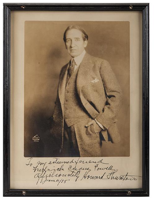 Thurston, Howard. Portrait of Howard Thurston, Inscribed to F.E. Powell. Columbus: Baker Art Gallery, ca. 1934. Handsome three-quarter length portrait of Thurston in a three-piece suit. Framed to an overall size of 12 ¾ x 9 ¾”. Visible corner crease. Inscribed and signed, “To my esteemed friend Frederick Eugene Powell affectionately Howard Thurston Jan 10/35.”