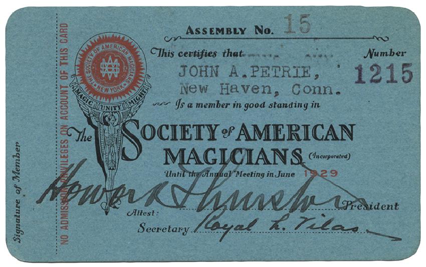 Thurston, Howard. John Petrie’s S.A.M. Membership Card, Signed by Thurston. New York, 1929. Thick cardstock printed in two colors, stamped number 1215, certifying Petrie for annual membership within Assembly No. 15, signed by Thurston (as president) and Royal Vilas (as secretary). 2 ½ x 4”.