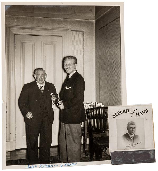 Ramsay, John. John Ramsay Souvenir Matchbook and Photograph. Unusual matchbook circa 1920 bearing the text “Sleight of Hand” and Ramsay’s portrait on the recto, and the text “Sleights and Lights from Ayr” on the verso. Sold together with a photograph of Ramsay and Dai Vernon, ca. 1955.