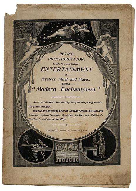 Petrie, John. Petrie Prestidigitator. Entertainment of Mystery, Mirth, and Magic. New Haven, ca. 1890s. An early four-page program for Petrie, illustrated with engravings of feats of conjuring. 8 ½ x 6”. Chipped upper left corner, light foxing and soiling.