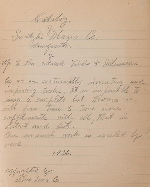Petrie, John. Manuscript Magic Catalog for Swastika Magic Company. New Haven, ca. 1890s and later. Three pieces, including a paper notebook, 8vo, being a draft in Petrie’s hand of the supply catalog, his writing comprising approximately 20 pages, with a hand-drawn pencil logo laid inside an envelope on the inside front cover; an undated 16-page stapled date-book apparently recording his correspondence with various firms and magicians; and a Petrie-Lewis “Ultra” catalog, possibly the company’s own copy, with dozens of instructions to various tricks issued by the firm tucked inside.