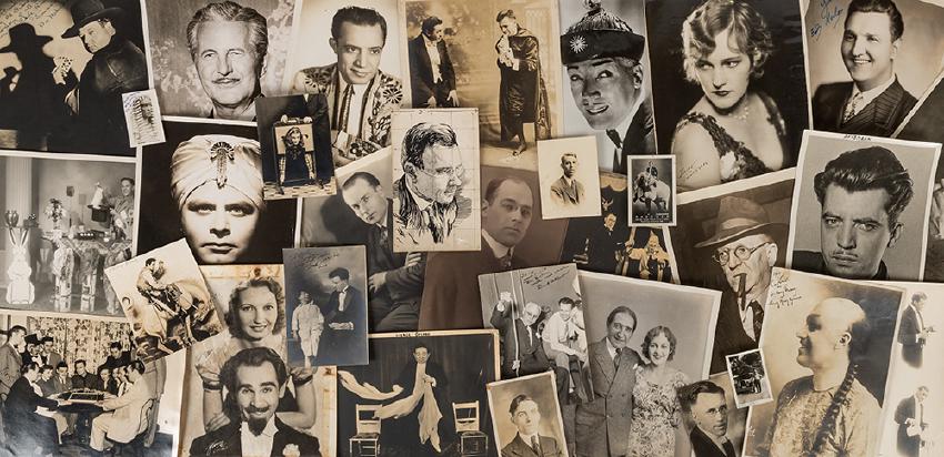 Massive Archive of Hundreds of Vintage Conjuring Photographs, Some Signed. Bulk American, early to mid-twentieth century. A superlative photo archive, spanning twelve volumes and containing several hundred images (8 x 10” or smaller) and including signed studio and publicity photographs and candid snapshots of numerous notable and lesser-known performers, including: Howard and Jane Thurston, “Doc” Nixon, Theo Annemann, Dai Vernon, Horace Goldin, McDonald Birch, Bert Allerton, Doc and Anne Mahendra, T. Nelson Downs, Sid Lorraine, Si Stebbins, Ed Marlo, Tony Slydini, George Schulte, Al Munroe, Great Leon, Bill Neff, Harlan Tarbell, Elmer Eckam, W.W. Durbin, Virgil, Frank Ducrot, E.A. Wilson, Mark Wilson, Monk Watson, Marshall Brodien, Roy Benson, Russ Walsh, Clarke Crandall, Eugene Laurant, John Mulholland Doug Henning, and many others; also including escape artists, mystics and mind-readers, banquets and gatherings, magic shops, and numerous early variety show, vaudeville, and amateur artists. Two albums with images pasted down, others tipped in with corner mounts. Should be seen.