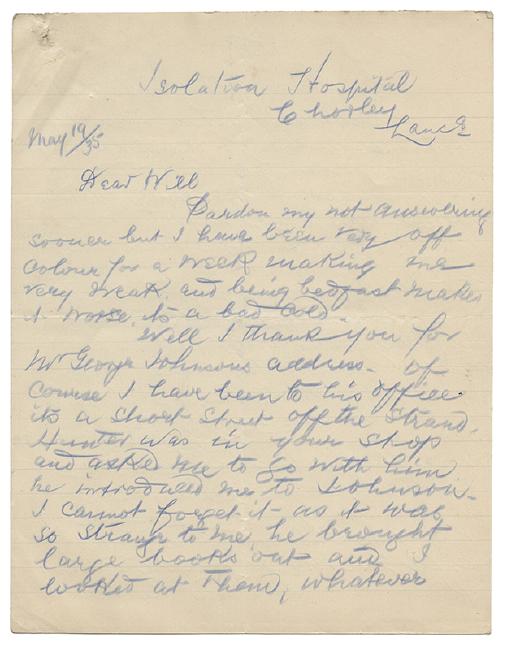 Morritt, Charles. File of Letters from Morritt to Various Magicians. V.p., 1913/14/28/35. Ten pages total, comprising eight letters, all handwritten in fountain pen or pencil, correspondents comprising Will Goldston, Stanley Collins, and Sidney Oldridge, the latter written in 1928 on Morritt’s behalf by his wife (signed “B. Morritt”) and relating that his recent illness had prevented him from corresponding personally. The others in Morritt’s own hand and signed “Charlie” or “C. Morritt”, including a string of May 1935 letters to Goldston, addressed from Isolation Hospital (Chorley, Lancashire), regarding his declining health and plans to publish his biography. The final four letters, to Collins, dating 1913—14 and addressed from St. George’s Hall or other locations, on various matters including his acceptance of an invitation to join the Magicians’ Club (London), appointments, and business transactions. Collins letters stapled on album page, others loose, one accompanied by original mailing envelope addressed by Morritt.