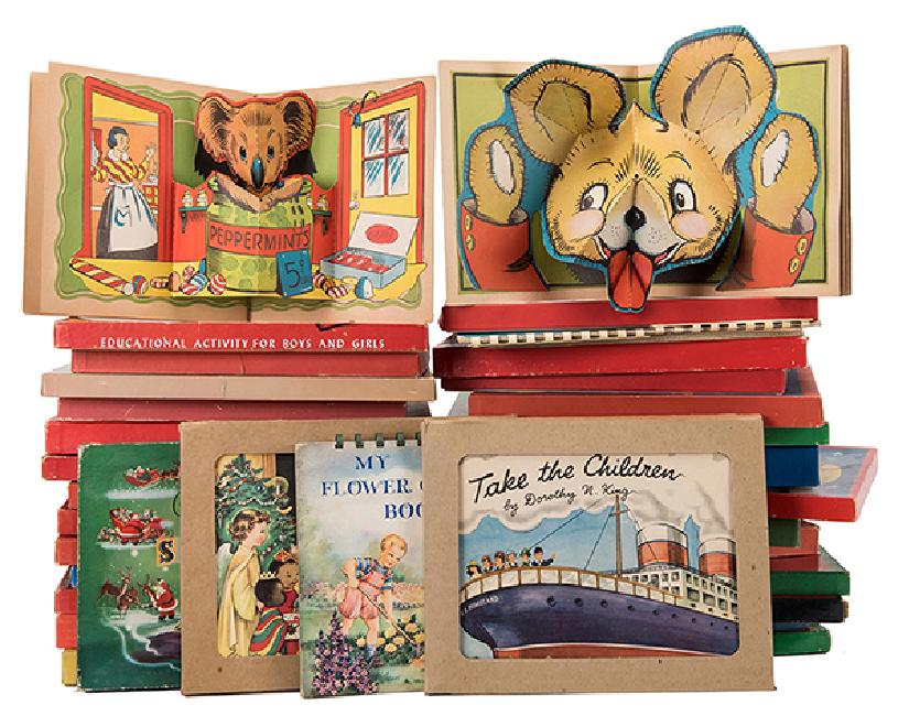 [Pop-Up] Lot of Christmas Pop-Up, Movable, Noise-Making, and Interactive Books. American, 1940s—50s. An impressive collection, together approximately 40 volumes of twentieth century titles, all but five Christmas themed, with many first editions, many in original pictorial boxes, and generally in fine condition, being in near or full states of completeness including inserts, fold-outs, instruction slips, and other pieces. Includes:Pranky’s Christmas (in box) COMPLETE(No Publisher, No Date)Charlot ByjThree pop-upsRound plastic skill puzzle (silver balls in a clock face) shows through die-cut hole in coverPeppermint candy (title page)Die-cut lower half of page with candy cane pipe cleaner (p.9)Two sheets of gummed stickers in pocket (p.12)Die-cut hole (p.16)Christmas in Fairyland (in box) COMPLETE (No Publisher, No Date, ca. 1950)No Author, No IllustratorCover has die-cut white foam moon and glitter starsEnvelope inside front cover contains:Sheet of gummed StickersSheet with numbers which key the gummed stickers to the spots on the bookSheet of punch-out game piecesSanta crownWhistle (p.2)Die-cut Fairy Queen figure (p.4)Die-cut reindeer (p.7)Gold star on red pipe cleaner: magic wand (p.11)Tatoo bubble gum (p.13)Game on back coverSanta’s Fun Book (in box) NEAR COMPLETE (White Plains Greeting Card Corp., 1954)No Author, No IllustratorFour pop-ups and moveablesDie-cut hole in cover (p.1)Yellow metal clicker (p.2)Silver metal bell (p.4)Die-cut hole in page in shape of star (p.5)Emb