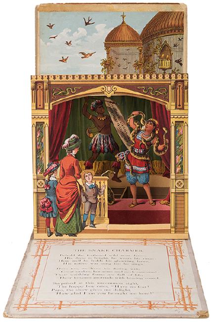 [Pop-Up] The Snake Charmer [Little Showman’s Series]. New York: McLoughlin Bros., (1884). Color pictorial boards, opening to reveal a pop-up theater display of the snake charmer, with lines of verse printed below. Edges shelfworn, else good.