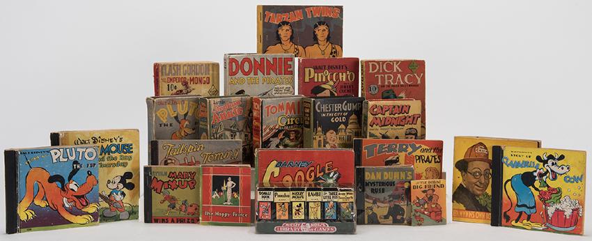 [Children’s Literature] Collection of Big Little Books, Midget Comics, Premium Strips, and Related Publications. American, bulk 1930s—40s. Approximately 50 pieces, series including Tailspin Tommy, Mickey Mouse (and other Disney characters), Captain Midnight, Chester Gump, Tom Mix, Dick Tracy, Little Orphan Annie, Terry and the Pirates, Flash Gordon, Dan Dunn, Captain Midnight, Donnie and the Pirates, Barney Google, Moon Mullins, Captain Marvel, Jr., Bulletman, Little Kip, and others. Condition generally good.