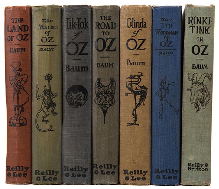 [Children’s Literature. Oz] Baum, L. Frank. A Group of 7 Oz Books. Includes: Rinky Tink in Oz (Chicago, 1916); The Tin Woodman of Oz (Chicago, 1918); Glinda of Oz (Chicago, 1920); The Road to Oz (Chicago, 1909); Tik-Tok of OZ (Chicago, 1914); The Magic of Oz (Chicago, 1919); and The Land of Oz: A Sequel to the Wizard of Oz (Chicago, lacking t.p.). Colored cloth with pastedown illustrations. 4to. All fair to good condition.