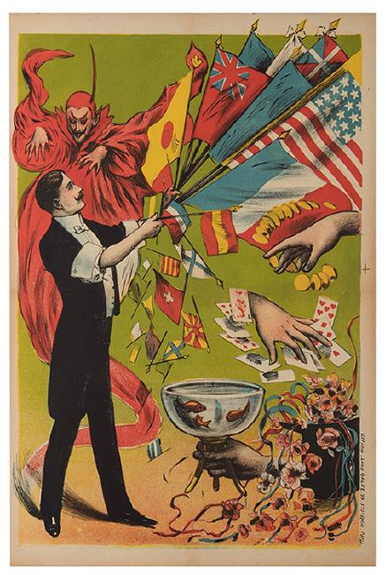 Conjuring Magician Stock Poster. Paris: Louis Galice, ca. 1920s. Color lithograph stock poster by the popular printmaker, featuring a magician producing flags and other magical implements from his sleeves, joined by a devilish figure. 23 ½ x 15 ¾”. Old folds visible, toned. A-.