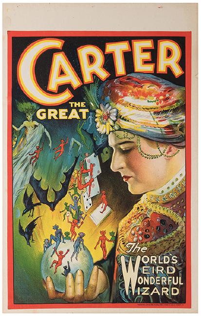 Carter, Charles. Carter the Great. The World’s Weird Wonderful Wizard. Cleveland: Otis Litho, ca. 1926. Finely detailed color lithograph window card depicting Carter in profile, summoning spirits from the crystal ball in his hand. 22 x 14”. Some rubbing of ink on margins. A.