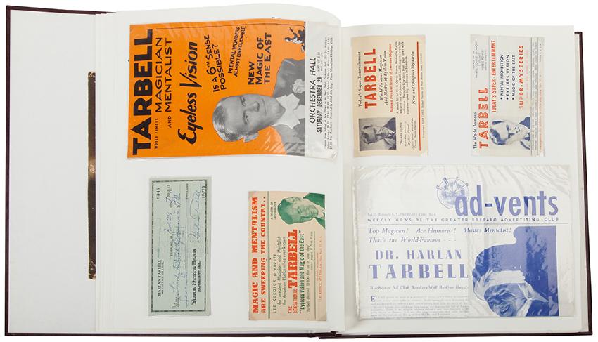 Tarbell, Harlan. Scrapbook of Harlan Tarbell Magic Ephemera. Over 60 items, including brochures, postcards, flyers, handbills, and photographs (candid and one signed 8 x 10” portrait) of the famous magician, illustrator, and author. Of special note are several letters of endorsement for the original mail-order Tarbell Course from noted performers including Max Holden, Leo Rullman, Birch, Dorny, John Mulholland, and Eddie McGuire (on Malini letterhead), Ade Duval (ironically written on letterhead designed by Tarbell himself). Also included is a cache of scarce printed material for the Baker Course in Magic, the first and failed attempt at a correspondence course in conjuring which would eventually become the Tarbell Course. 1910s – 50s. Neatly organized in a single album, with most objects removable. An outstanding collection on this important performer.