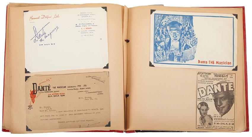Dante (Harry August Jansen). Scrapbook of Dante the Magician Ephemera. Over 75 items, including photographs (studio and candid; in one Dante poses with Murray and Horace Goldin), theatre programs, comp passes, tickets, souvenir programs, table tents, advertising brochures, newspaper clippings, broadsides, TLSs (one from Dante to Nicola), and more. 1930s – 50s. Neatly organized in an album, most items held in place with photo corners.