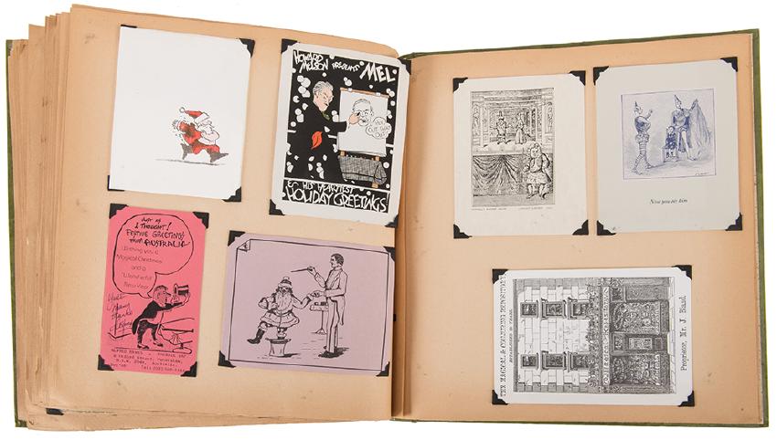 [Magicians’ Christmas Cards] Collection of over 650 Magicians’ Christmas Cards. Lifetime collection of Christmas sentiments issued by famous magicians, magic shops, and magic collectors. Examples include cards from Warren Hamilton, Thayer Manufacturing Co., Sid Lorraine, Fred Keating, Milton Bridges, Gogia Pasha, Jack Gwynne, Greystoke, Eugene Laurant, Max Holden, Ade Duval, Kolar, W.W. Durbin, Ricky Jay (Mulholland Library), Dell O’Dell, Ed Miller, Okito, Harry Kellar, John Braun, David Price, Al Munroe, and approximately 100 more. Hundreds of cards signed or inscribed. Neatly organized in five large albums. Most items mounted (not stuck down). A handsome collection. Should be seen.