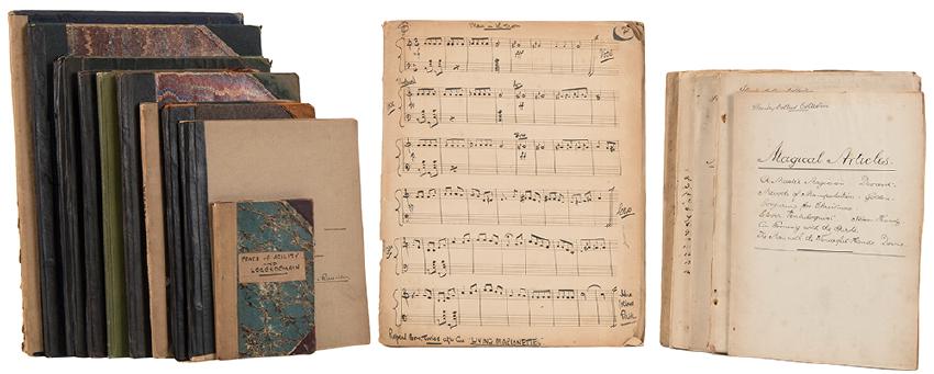 Collins, Stanley. Collection of Scrapbooks and Sheet Music Kept by Collins. A fascinating trove including several music scores transcribed or composed by Collins in his own hand, and 17 bound files of magic-related extracts from late eighteenth to early twentieth century periodicals and books, several neatly titled calligraphically with the contents, on subjects or by authors including Hoffmann, Houdini, automata, and sleight-of-hand. One volume containing clippings of Collins’ own writings, bearing lengthy handwritten marginalia. Most volumes signed “Stanley Collins Collection” and bearing his bookplate.