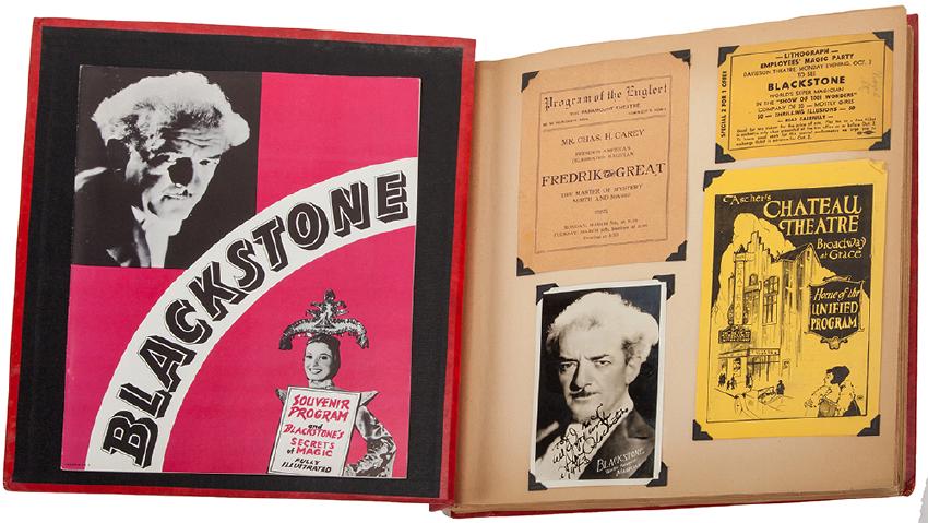 Blackstone, Harry (Henry Boughton). Two Scrapbooks of Harry Blackstone Ephemera. Over 100 items, including photographs (two boldly inscribed and signed; many small candid images from the 1920s, and many 8 x 10” images, both studio shots and candids); theatre programs (two signed by Blackstone), newspaper clippings, programs (one from Blackstone’s time as Frederik the Great), handbills, advertising and promotional material (bubblegum wrappers, novelty cards), envelopes and letterheads, souvenir programs, and a small cache related to Harry Blackstone Jr. 1910s – 70s. Neatly organized in two albums, most items held in place with photo corners. Nice lot.