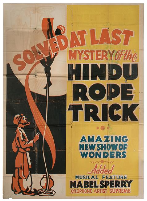 Birch, McDonald. Two Large Birch Posters. Mason City: Central Show Printing Co., ca. 1930s. Includes poster featuring the illusionist’s “Sensational Vanishing Pony” trick, and an uncredited poster featuring the Indian Rope Trick, “Solved at Last”. Xylophonist Mabel Sperry is also advertised. 41 x 28” and approx. 57 x 42”, respectively. Both with visible staining and restoration marks, tears at folds, but colors vibrant. C.