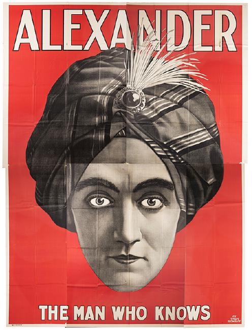 Alexander (Claude Alexdander Conlin). Alexander the Man Who Knows. Bombay: Av Yaga, ca. 1915. Six-sheet lithograph poster featuring a portrait of Alexander, adorned with a turban, against a red background. Approx. 55 x 44 ½”. Folded. Tears along folds, but colors vibrant. B. Unmounted.