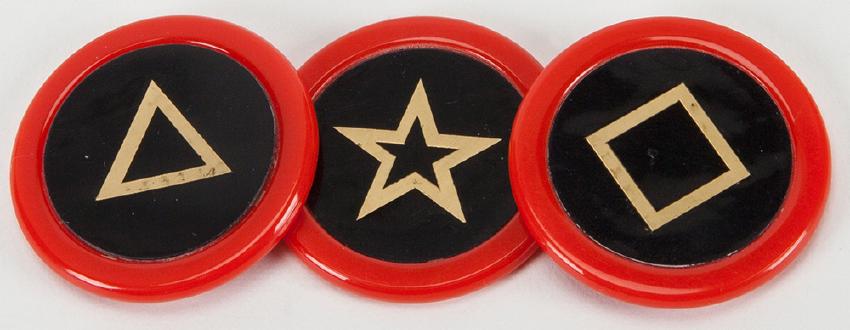 Card Chips. Holland: Eddy Taytelbaum, 1960s. Three laminated chips with hand-painted shapes on each side, to be used as markers for various card tricks. 1 x 1/16”. Fine.