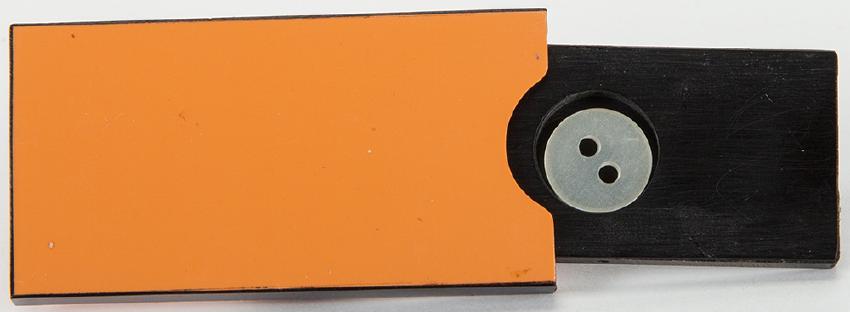 Button Slide. Holland: Eddy Taytelbaum, 1960s. A celluloid slide and thread are inserted into a colorful case. When opened, a button has magically been threaded on the slide. Case 2 1/8 x 1 1/8”. Fine. This being the first Button Slide effect ever produced by Taytelbaum.