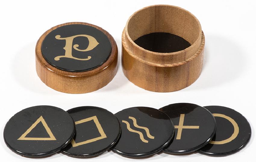E. S.P. Miracle. Holland: Eddy Taytelbaum, 1960s. A turned wooden box holding eight black discs, five of which feature E.S.P. symbols in gold. The blank discs are stacked together, only to reveal the spectator’s chosen E.S.P. disc at the bottom of the stack. Box 1 5/8” wide. Fine.