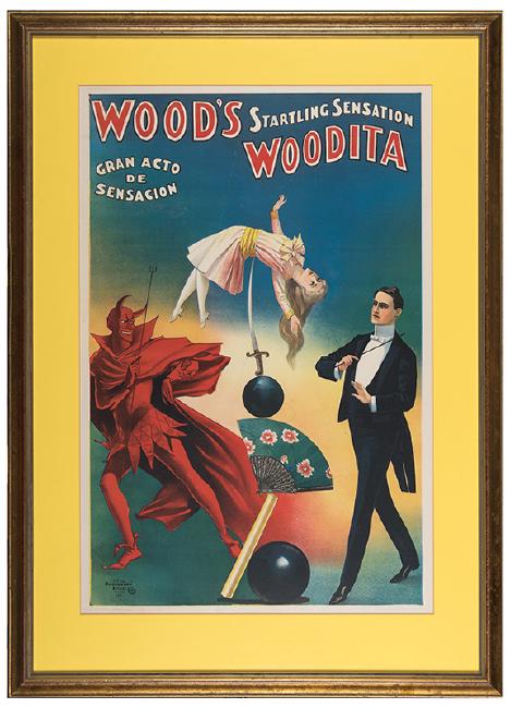 Wood, William. Wood’s Startling Sensation Woodita. Newport: Donaldson Litho., ca. 1905. Richly colored lithograph depicting Wood and a devilish figure on either side of a woman summoned on the tip of a sword. Framed to an overall size of 36 ½ x 26 1/8”. Minor spotting beneath title. A-.