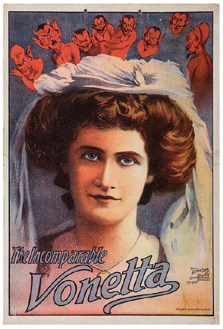 Vonetta (Etta Paul). The Incomparable Vonetta. London: David Allen & Sons, ca. 1905. Double-ply color lithograph portrait window card of the magician, a group of imps above her with varying expressions of surprise, dismay, and laughter. Punctured upper margin, as issued; slight scuffing and marginal wear, cloth tape affixed to verso. A-.